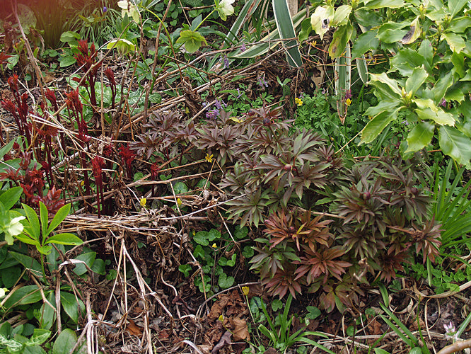 The early foliage is superb - deeply cut and dark glossy bronze, early dark red single flowers filled with gold stamens Apr-May, neat 45cm.