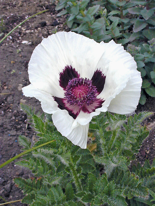 Pure white flowers with black patches at the base of each petal which sometimes mutate to intruiging greyed pink stains with yellowish edges likes old severe bruises May-Jun, 75cm. Easy.