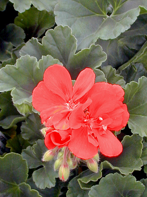 Large semi-double scarlet flowers May-Nov, compact deep green foliage, 30cm.