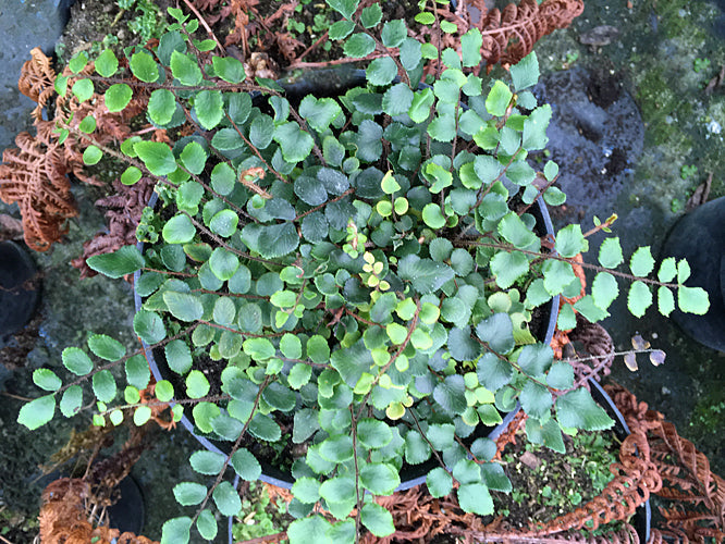 Neat airy plants , fronds with improbable round pinnules looking a bit like Lonicera nitida, 15cm. Happy in dry air and drier sites (but it still needs an ordinary amount of water), acid soil. NZ and Australia.