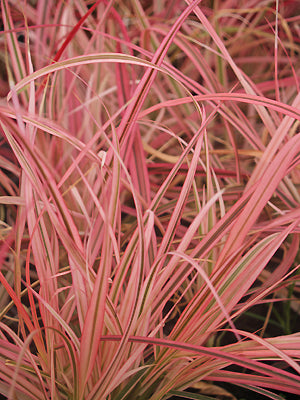 Variegated grass with cream, burgundy (and green) foliage and red plumes, 55cm. Half shade. Tender. Good pot specimen. PVR - propagation for resale prohibited.