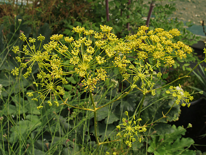 Light feathery herbaceous grey-green leaves and heads of yellow flowers Jul-Aug, 65cm. Cut stems smell of hot oil.