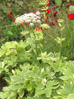 White flowers Jun-Jul, scented cream-edged grey-green pinnate foliage, 70cm. Good soil, part shade. Found in France, the species naturalised in Britain.