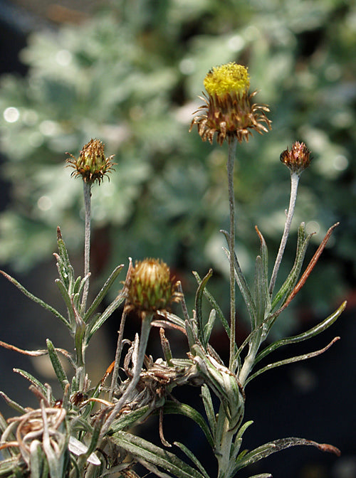 Compact silvery narrow-leaved shrubbette, small washed-out narrow thistly flowers, 35cm.