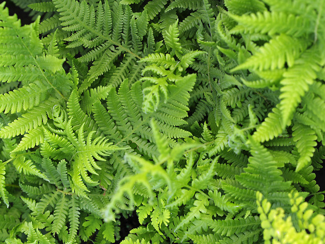 Beech fern. Short deltoid deciduous dull green fronds hairy on both sides, 20cm. Damp shade, acid soils.