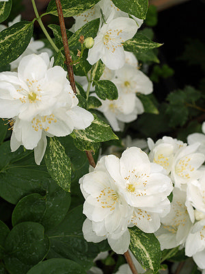 Dark foliage with bright streaks of cream THAT STAYS GOOD THROUGHOUT THE SEASON, larger scented (open) bowl-shaped white flowers with creamy stamens later than 'Variegata' Jun-Aug, 2-3m but 1.5m with saw (better).
