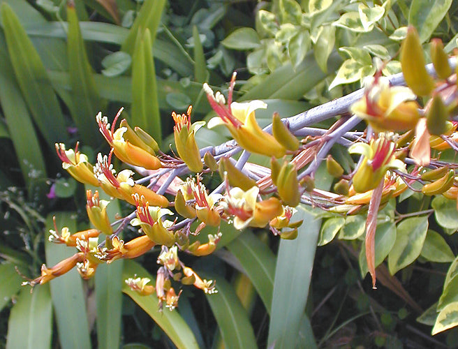 Pewter-grey evergreen foliage 1m, black and gold flowers Jun-Jul 2m. Hardy.