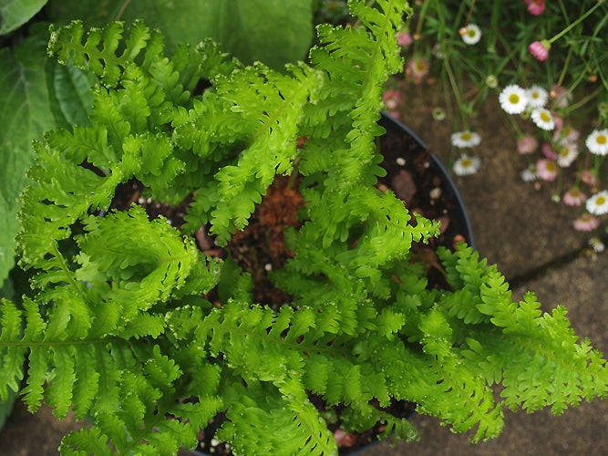 Deeply cut slightly crisped and imbricated bipinnate fronds, 25cm. Lovely.