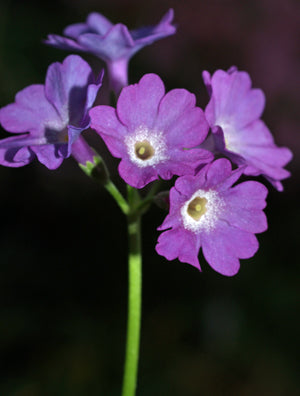 Delicate mauve flowers on relatively tall dark stems (Oct)Mar-May, rounded green auricula-like foliage, 23cm.