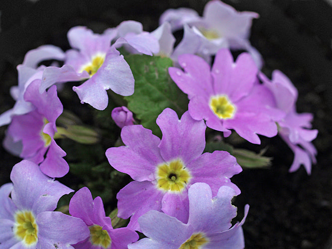 A typical vigorous juliana hybrid with small abundant foliage, but much larger purple flowers than normal that fade mauve with creamy greenish-yellow eyes surrounded with a faint white ring Dec-May, 12cm. Heritage plant.