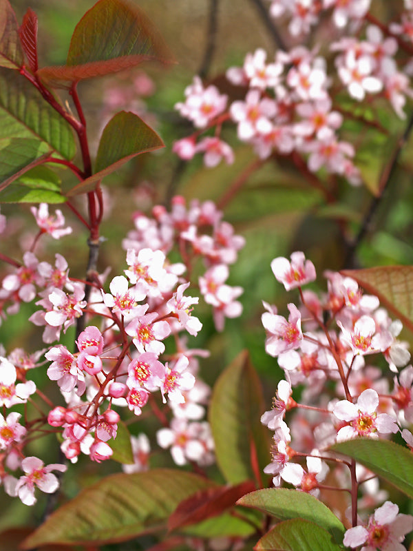 Purple leaved bird cherry (which is a British native). Long clusters of pretty pink flowers Apr-May, 1-6m depending on pruning.