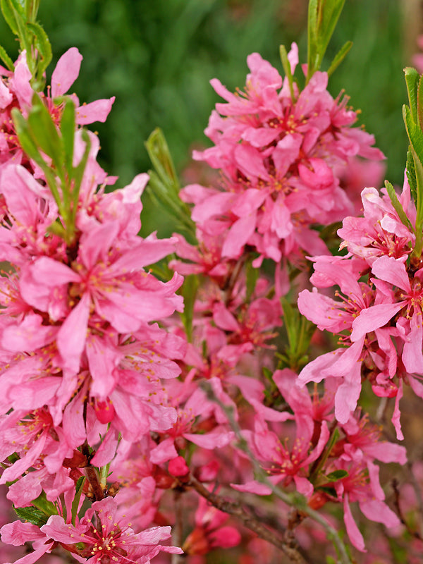 Pretty pink almond flowers on a short twiggy mildly suckering bush Mar-Apr, 1m. Easy. (Russian almond.)