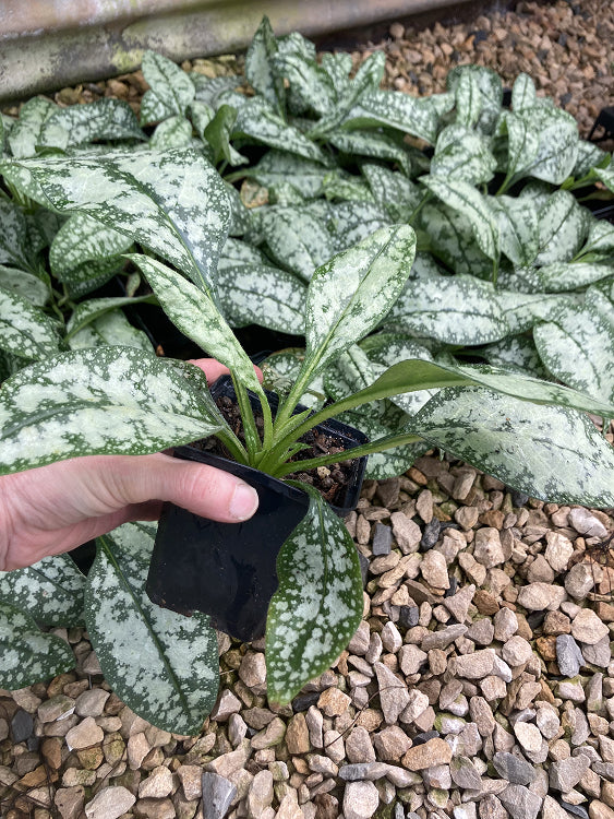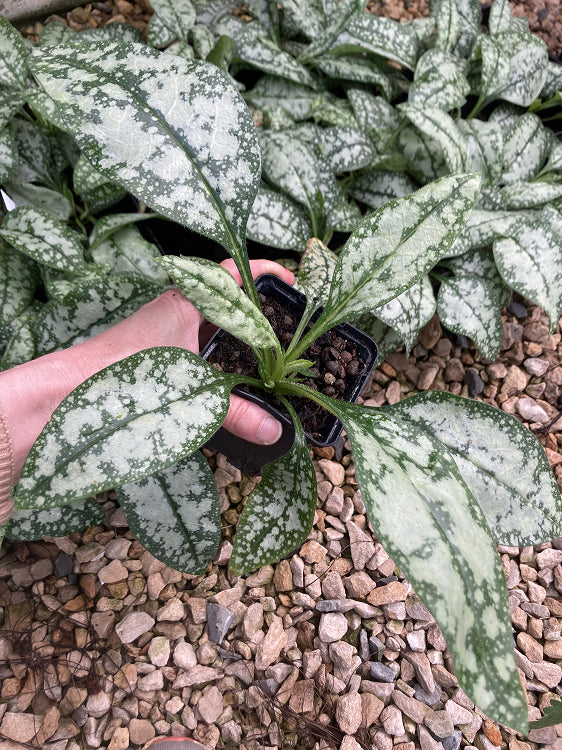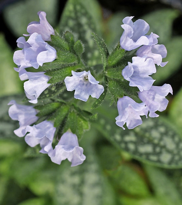 Compact form, large opalescent pale blue flowers the colour and shape of plastic bath caps Mar-May, good silver-spotted dark green leaves, 25cm.