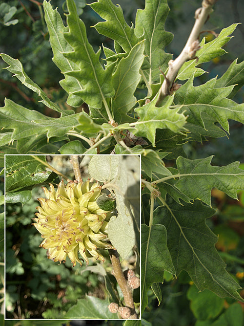 Silvery green foliage with pointed lobes on the leaves. The acorn cups are large and covered in petaloid growths making them look like flowers, very slowly to 8m.