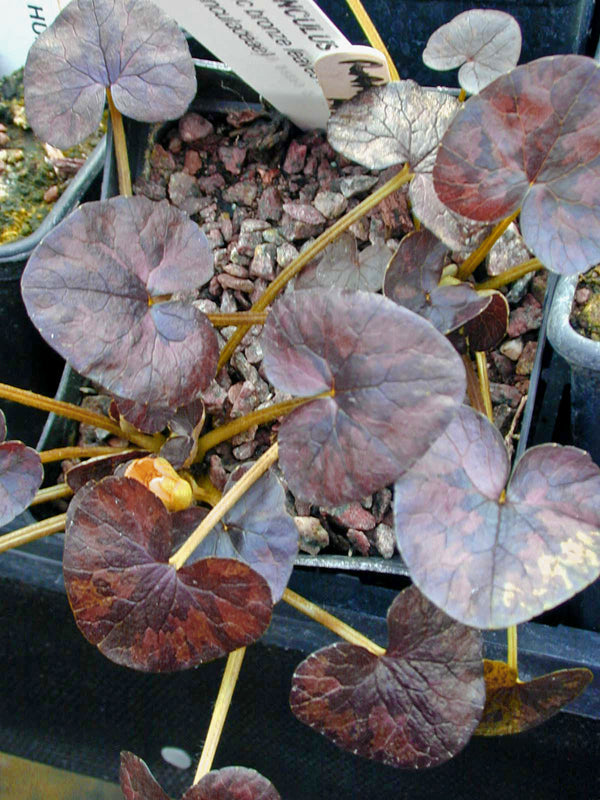 Metallic bronze leaves marked with black, yellow flowers, 10cm.