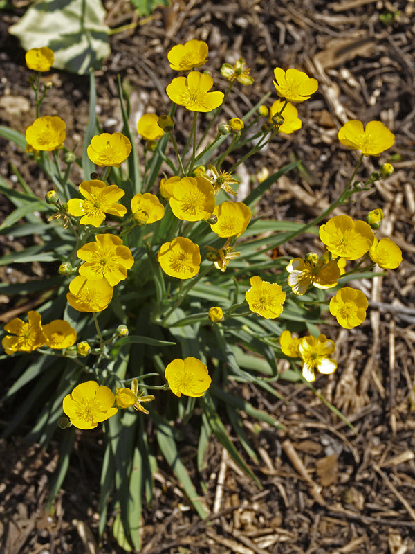 Buttercup flowers, grassy greyish leaves, 25cm. Not invasive and much better than it sounds. Any soil, sun or half shade.