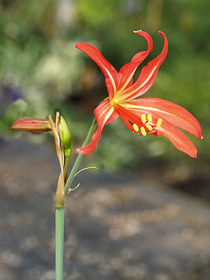 'Hardy amaryllis'. Startling scarlet up-facing flowers Jul-Sep, 20cm. In danger of extinction in its native habitat Chile/Argentina.