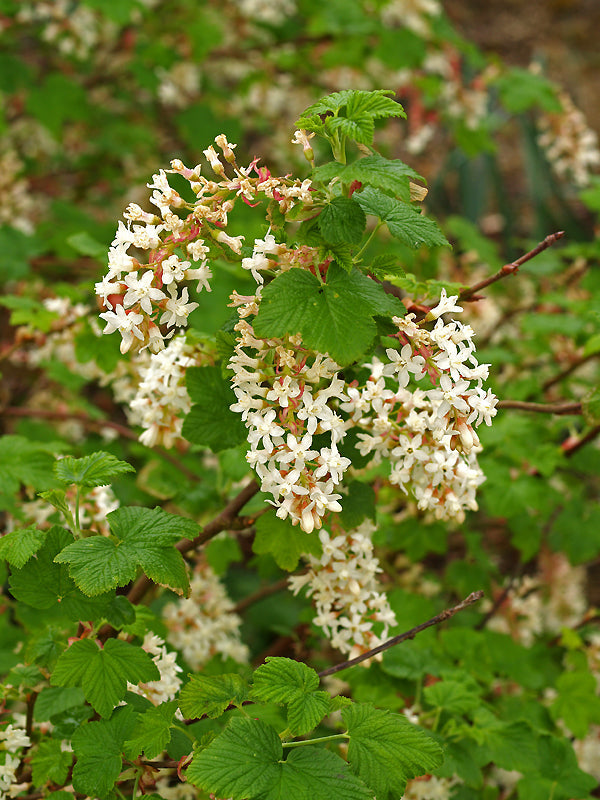 A striking deciduous shrub that produces cascading clusters of creamy white flowers with a delicate pink blush from March to May. Loved by pollinators, this early flowering currant thrives in well-drained soil and partial shade to full sun.