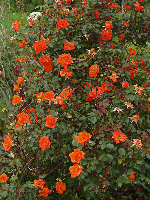 Climbing rose with clusters of smallish warm orange beautifully fragrant flowers from bottom to top all summer and autumn, healthy dark foliage, 2-3m. Sun. PVR - propagation for resale prohibited.