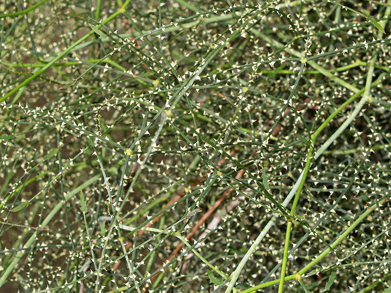 NZ bush lawyer - when you get entangled you can't get away. Short white spines on a dark green bushette with reddish overtones, white flowers Mar-May, 50cm. I use it as a superlative pot plant for the garden - getting more comments than any other plant. F