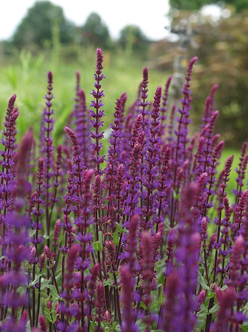 A compact perennial sage with vivid deep purple flowers on striking dark stems, blooming June to August, sometimes into November.