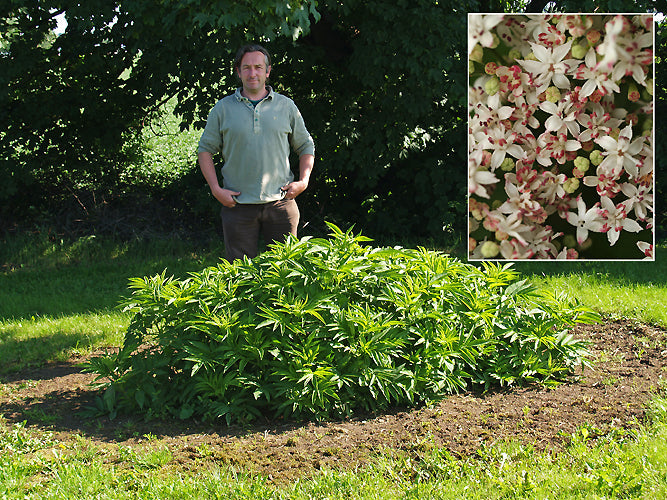 Herbaceous spreader, flat-topped cream flower heads with pinkish stamens Jul-Aug, 75cm. The plant reddens in summer. Caveat Emptor. Danewort.