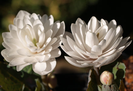 (Double bloodroot) Easy in semi shade and good soil. Nice glaucous foliage and stunning double white flowers Apr-May but only for a short period, 20cm. I prefer not to plan any days away during the flowering period.
