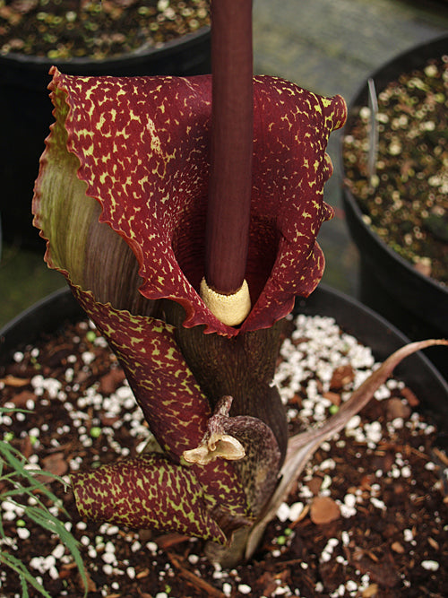 Impressive foliage. Strange tall black flowers May-Jun, mottled palm-like leaves, fruit large round and black at ground level, 50cm. Easy, hardy, multiplies, and quite likes dry shade. Nepal. (Voodoo flower).