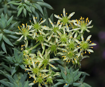Heads of pretty understated open grey-green and cream flowers, Really neat succulent evergreen grey foliage, 12cm. Spreading. Nice.