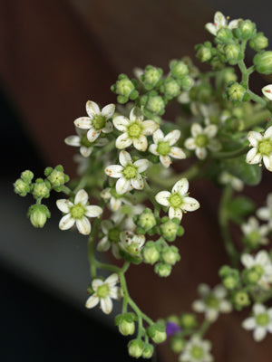 Loose heads of small white and green flowers Jun-Aug, bead-like oval succulent soft grey-green leaves 12cm. Rocky outcrops, Oued Sebou Gorge near Azzaba, Middle Atlas.