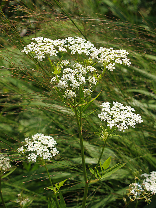 Skirret - an old staple vegetable ultimately originating in China but widely grown in Europe before potatoes took over. Herbaceous perennial, white flowers Aug-Sep, 1m. Both roots and young shoots are eaten. Synonym Pimpinella sisarum.