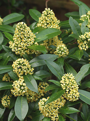 Compact broad-leaved evergreen shrub, bunches of scented greeny-cream flowers bud Aug-Feb overwinter, flower Mar-May, 95cm. The whole plant is a good green unlike most other skimmias.