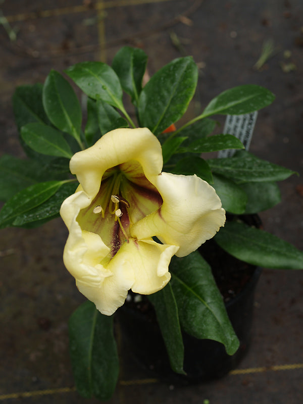 Very large open cream out-facing flowers with maroon markings inside, glossy evergreen foliage. Flowers at any time depending on the degree of protection but Apr-Nov for me. "Chalice vine" but my bushy form has stopped or not started, climbing. Mexico.