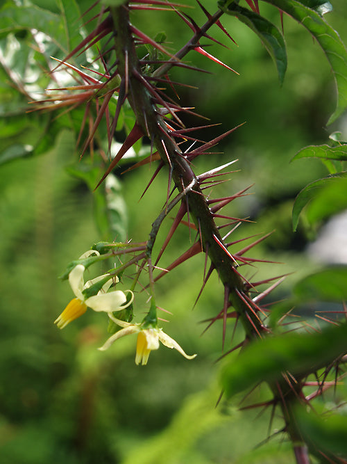 Profuse decorative shiny black prickles and spines all over the plant, clusters of orange-yellow fruits, 1m. Short-lived perennial hardy to -10C. Malevolence incarnate.