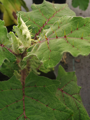 More amazing thorns! The large grey-green leaves are adorned with decorative thorns along the purple veins above and below, small grey flowers Jul-Sep, decorative fruits, compact till maturity at 1m. Decorative even as a seedling. Tender (Ecuador). Bed of