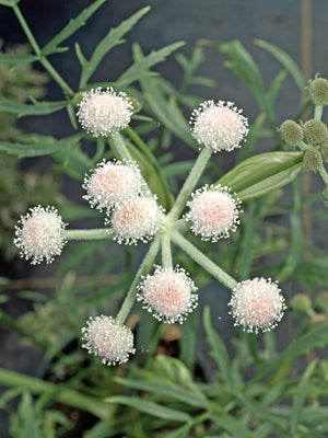 Umbels of tight pinky white flowers develop into tight grey-white balls of fluffy seed Jun-Aug, 90cm. Seed coll. Northern Sierra Nevada, Alpine Co., CA. 9325' altitude.