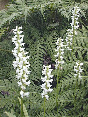 Tall spiralling spikes of heavily scented white orchid flowers Aug-Nov, 45cm. Vigorous, suckers to make a patch of plants. Improved loamy or sandy soil, not hot dry places.