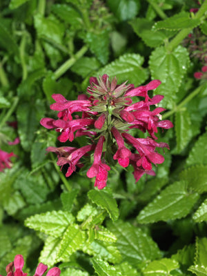 Rich wine-coloured flowers Aug-Oct, relatively small green crenate foliage, 45cm