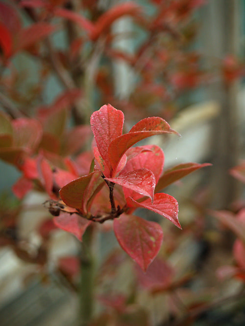 Camellia-related tree, rose-like white flowers Jun-Aug, good red autumn colour, ornamental cinnamon-coloured bark.15m x 6m. Not alkaline soils.