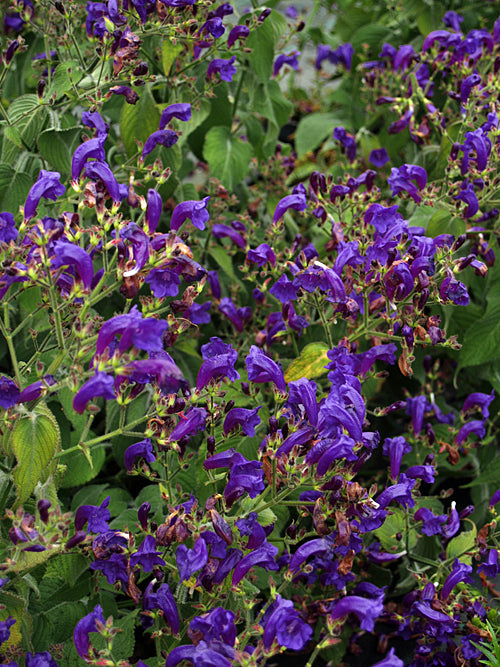 Perfect rounded bush-shaped herbaceous plant covered in unlikely large hooded purple flowers in late summer Aug-Sep, 1m. Easy. This is a good clone. Synonym S.urticifolia,