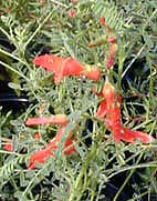 Spectacular vermilion pea flowers, large yellow pods, tender shrub, 60 x 60cm.