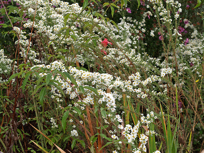 Clouds of smart out-looking white flowers Aug-Nov (not for the whole period) 1.5m. No diseases, no staking, no problems. New introduction from Rocky Mountains. Synonym Aster falcatus var. commutatus.