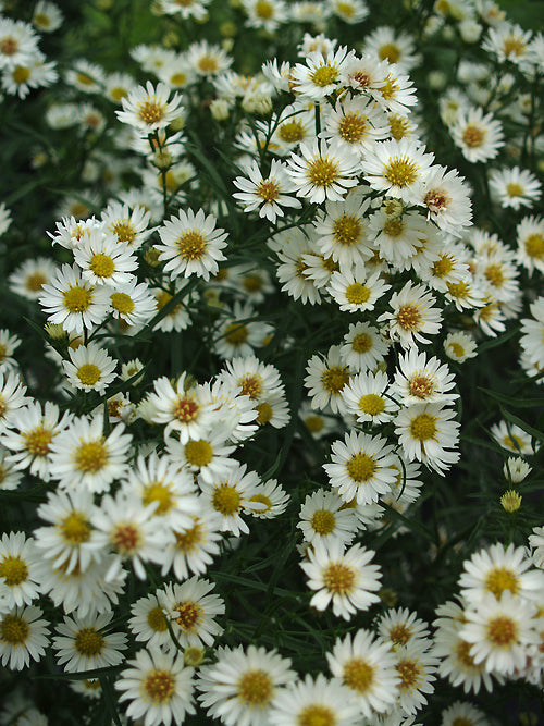 Airy cream flowers with yellow centres Aug-Oct, 80cm. Clumper. It really is cream. Synonym Aster pilosus.