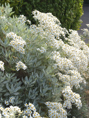 Flat feathery grey-white foliage, large heads of creamy white, soft yellow centred flowers Apr-Jun, 65cm. Tender (Canaries) but seems to live from year to year of late.