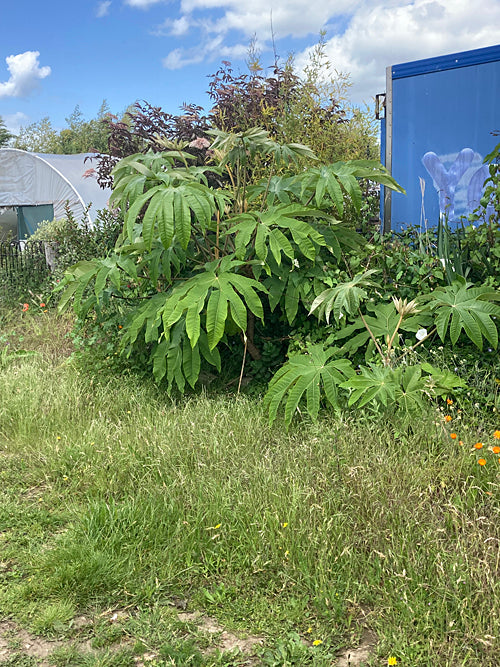 Hardy (herbaceous in hard winters). Enormous slightly shiny channeled palmate leaves each up to 1m wide, 2-5m. Shade or sun.