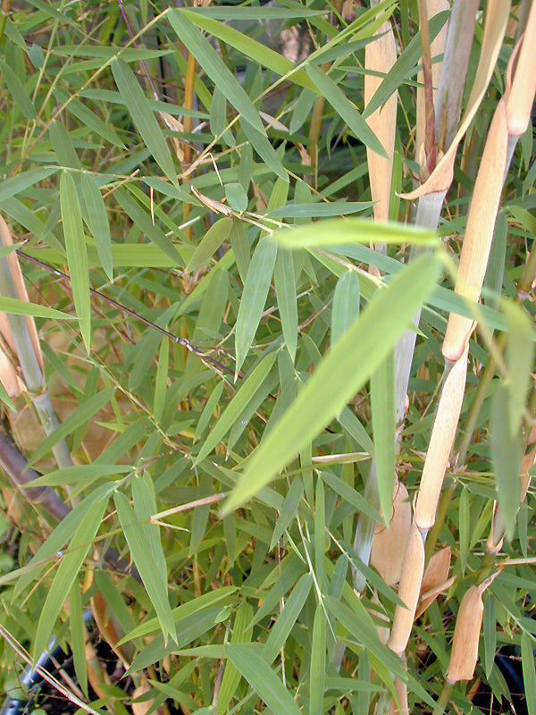 Pretty, relatively small bamboo, 2m (only just over 1m for me and, so far, uninvasive). The leaves develop grey-blue tints in sun.
