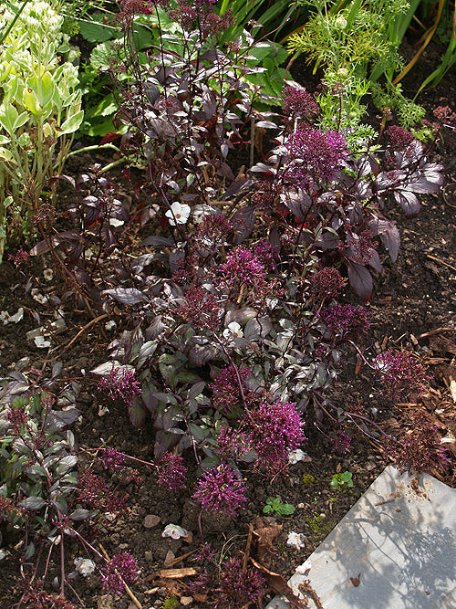 Deep purple fuzzy flower heads over black foliage, 30cm.