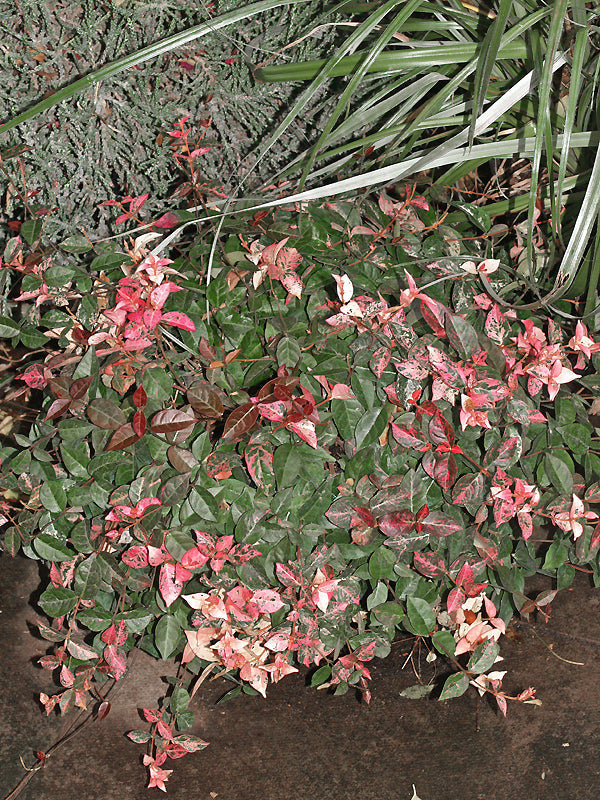 New leaves start baby pink turn cream (speckled green) then mature dark green and go redder in winter, scented cream flowers Jul-Aug, self-clinging climber 1m or bushy. Evergreen. Very slow grower. Mine permanently graces a pot.