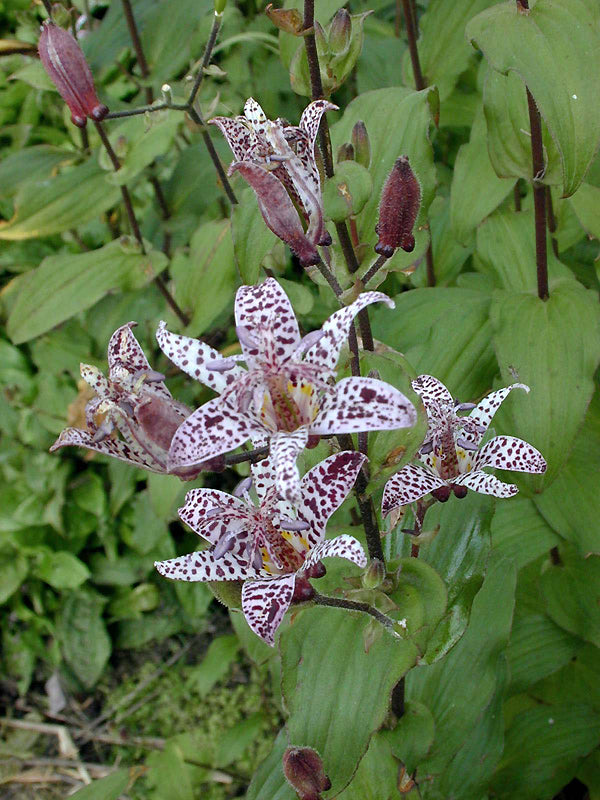 Panicles of open up-facing spotted purple flowers on stiff stems Aug-Nov, good spring leaves, 1-2m. Not full sun, not too dry.