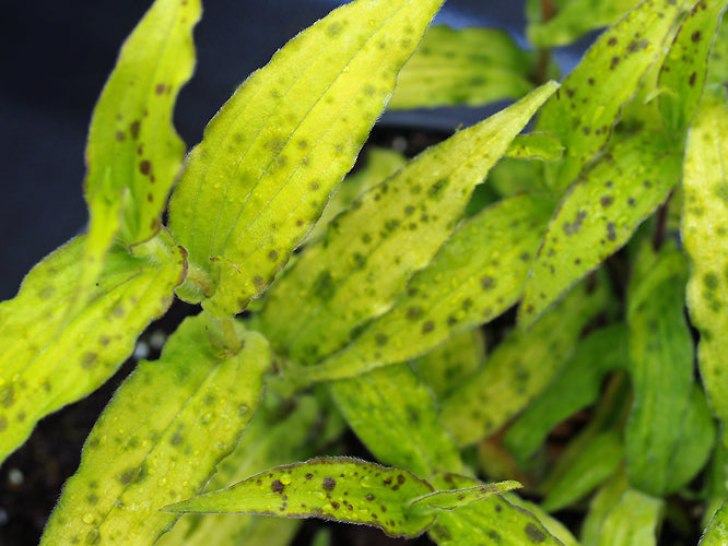 Shiny golden green foliage and pale spotted intricate flowers Sep-Oct, 35cm. Shade and not too dry.